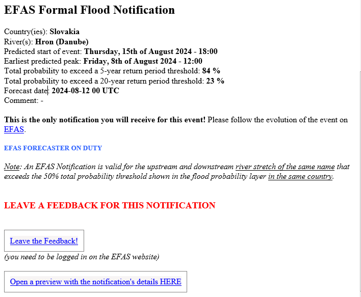 The EFAS notifications do not aim at summarizing all the detail of an EFAS forecast. Instead, they aim to raise the awareness about the risk of an upcoming flood in a specific river section and invite the EFAS partner to look at all the forecast details in the EFAS map viewer.