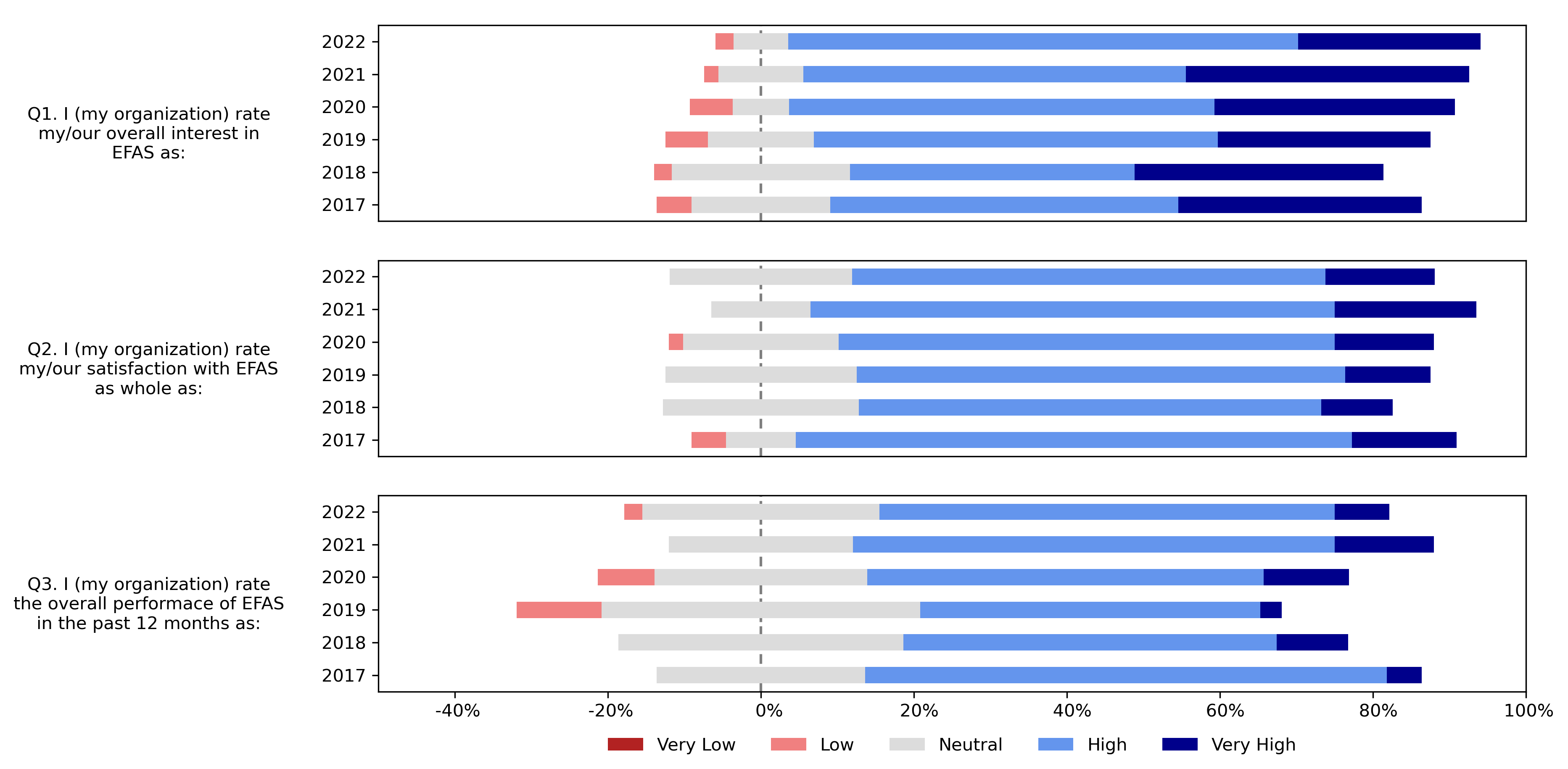 No major changes in the overall satisfaction were reported in comparison to the previous five years. As with the previous surveys, the responses in 2022 were very positive for overall interest, satisfaction, and performance. A noteworthy trend in the survey responses is that there has been increasing interest in EFAS since 2017.