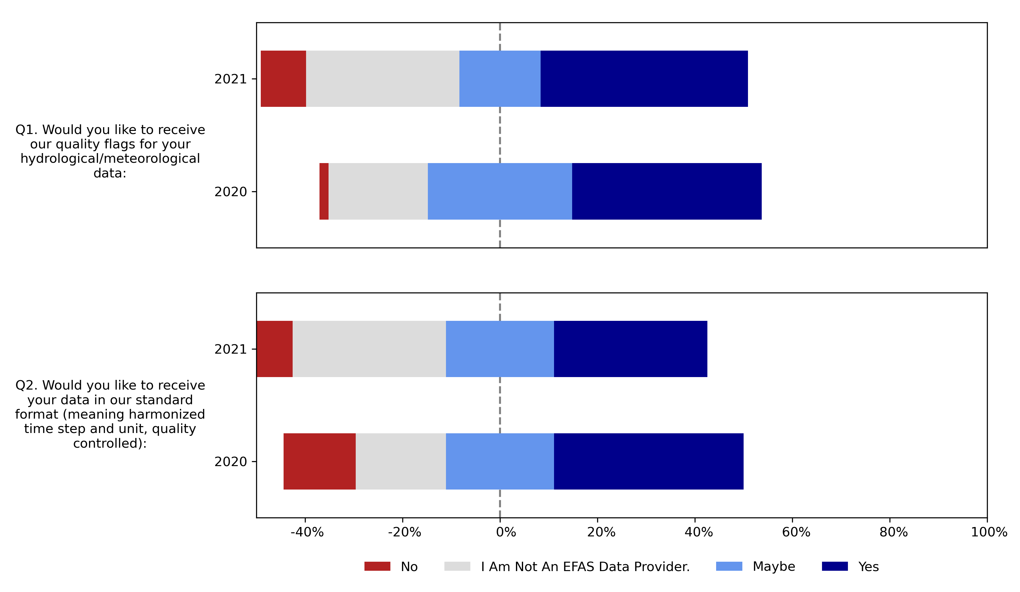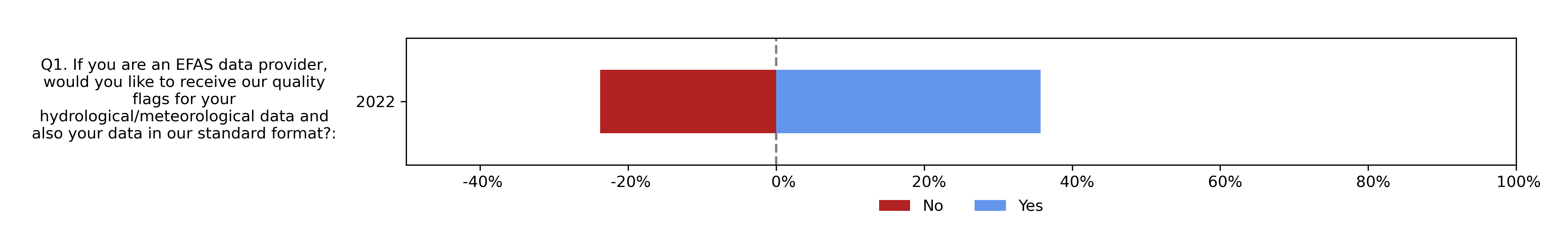 As in 2020 and 2021, survey participants were asked in 2022 if they would like to receive quality flags for their hydrological/meteorological data and their data in a standard format (meaning harmonised time step and unit, quality controlled). For the 2022 survey, these questions were merged into one question with only options for "Yes" and "No". In total, 25 of the 42 survey participants in 2022 were EFAS data providers, and 60% responded "Yes" to the question. Note that the figure only shows the results for the 25 data providers, and this is why the red + blue areas is less than 100%.