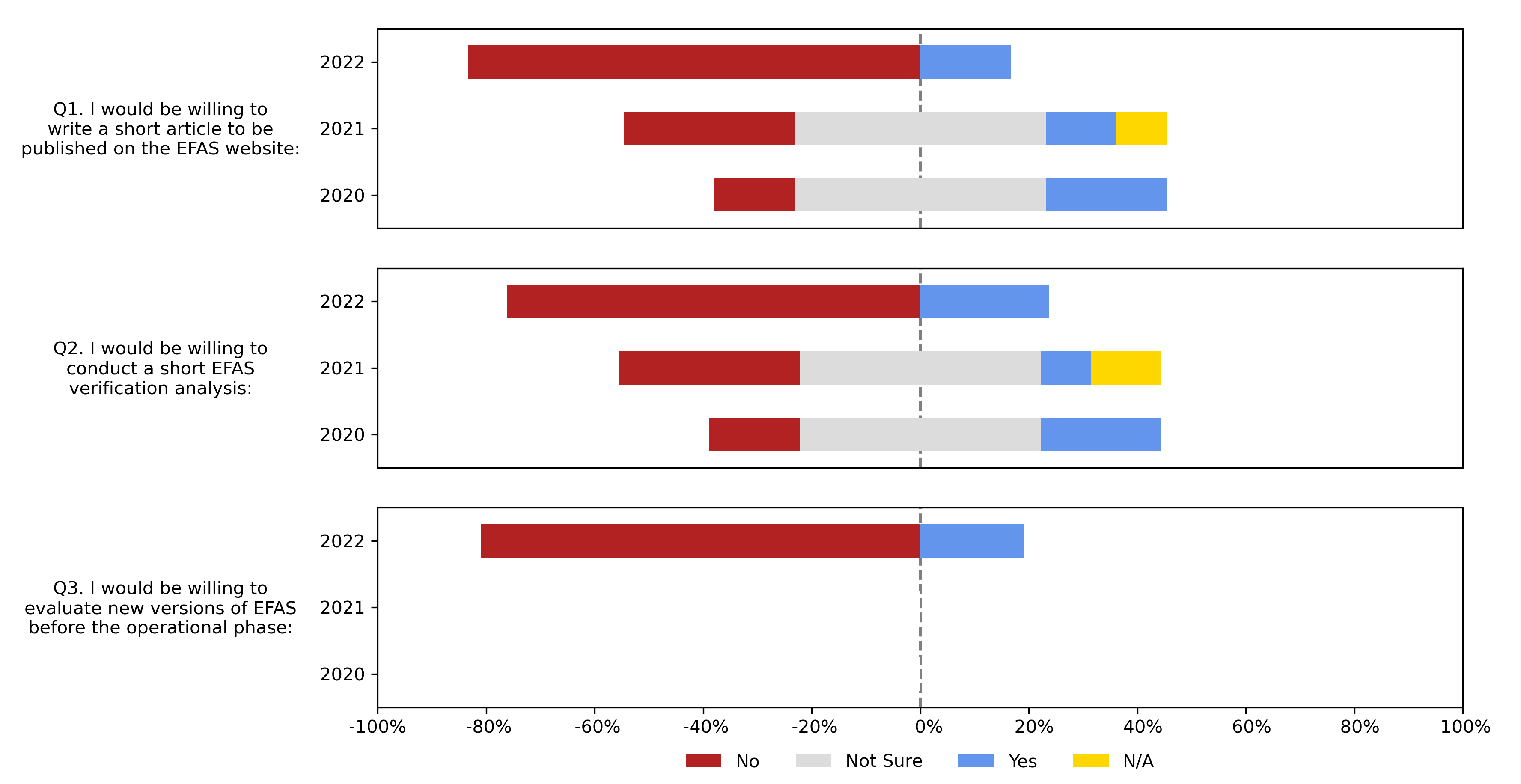 Some of the participants expressed their willingness to write short articles about EFAS, to conduct short verification analyses, or to evaluate new versions of EFAS before the operational phase. Note that the "Not Sure" and "N/A" options were removed for the 2022 survey.