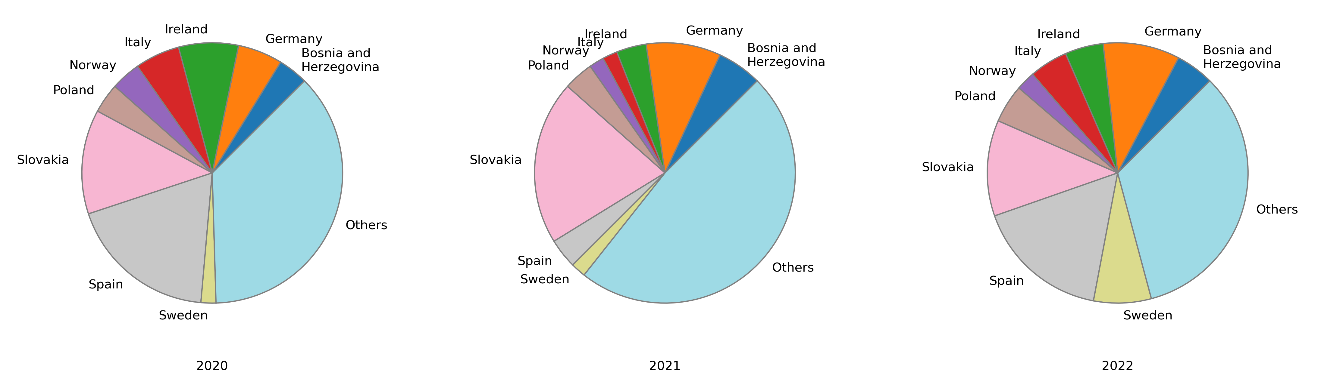 The distribution of country origin for the survey respondents was similar in 2020-2022, but the percentage of respondents from the "others" category was highest in 2021.