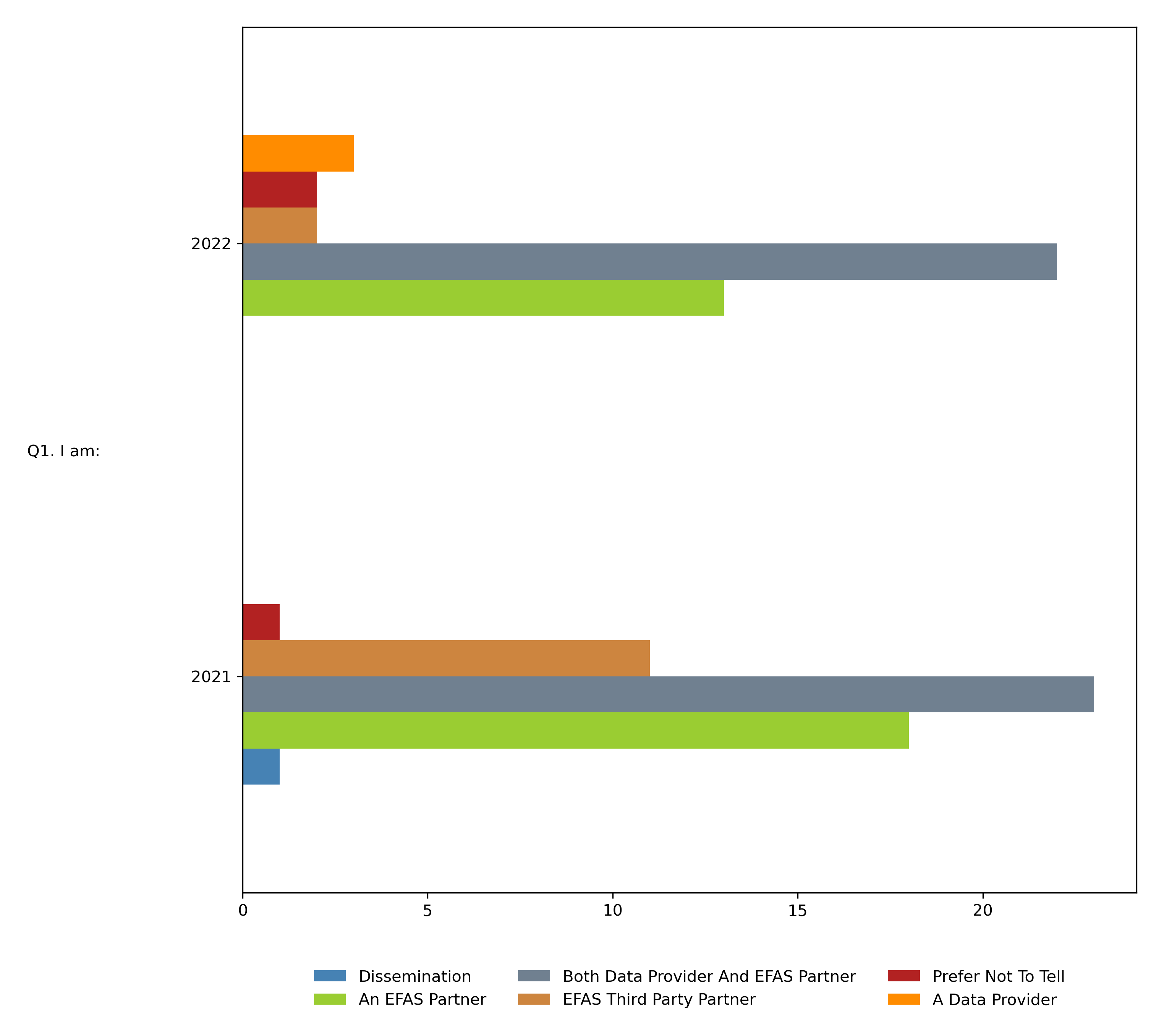 As in 2021, most of the participants in the 2022 survey were either an EFAS partner or both a data provider and an EFAS partner. However, there were fewer EFAS third party partners and more data providers who responded to the 2022 survey compared to the 2021 survey.