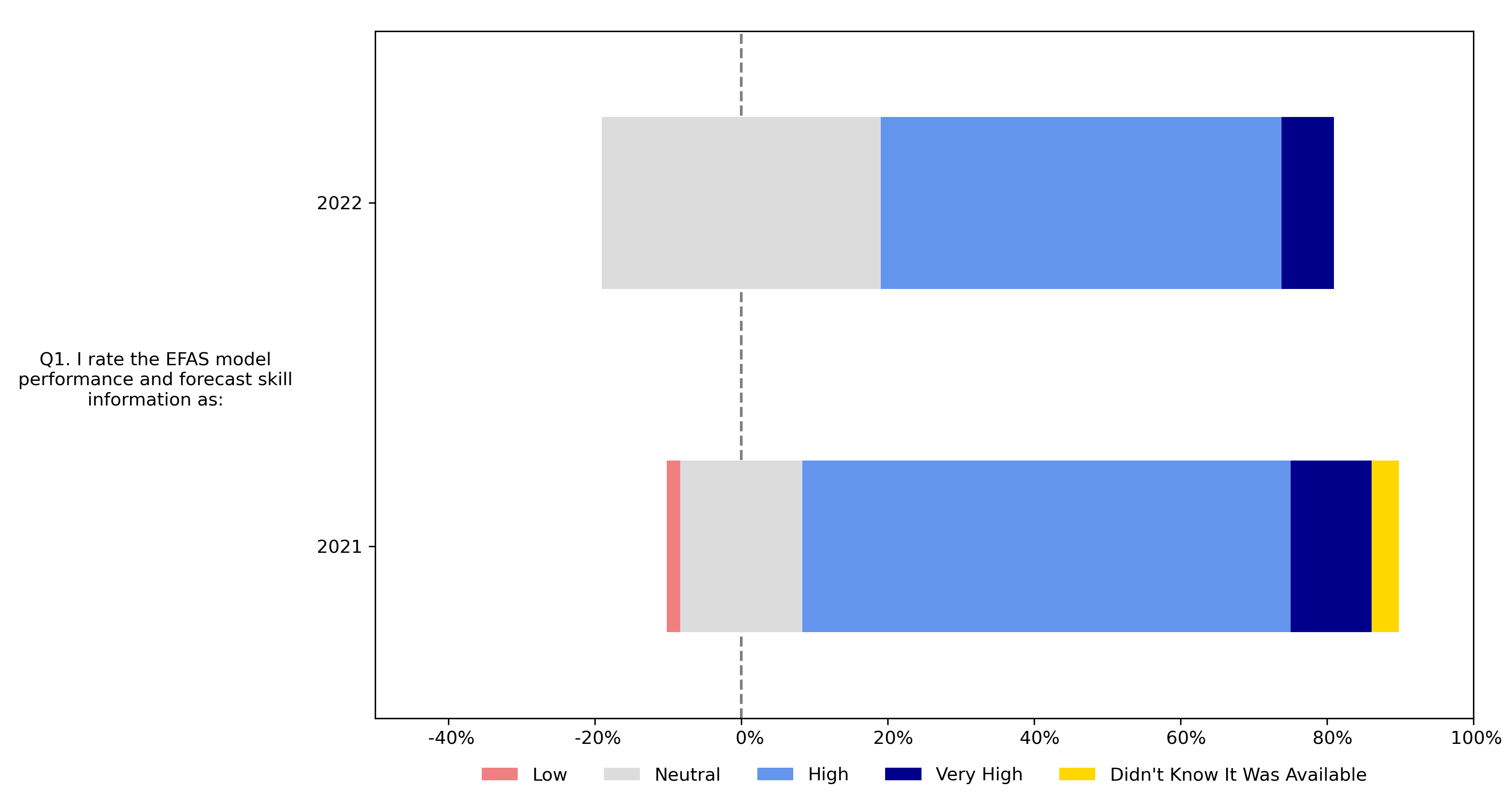 In 2022, the majority of the survey participants rated the EFAS model performance and forecast skill as high (55% of responses) or very high (7% of responses). However, 38% of respondents gave a neutral rating compared to 17% of respondents in 2021.