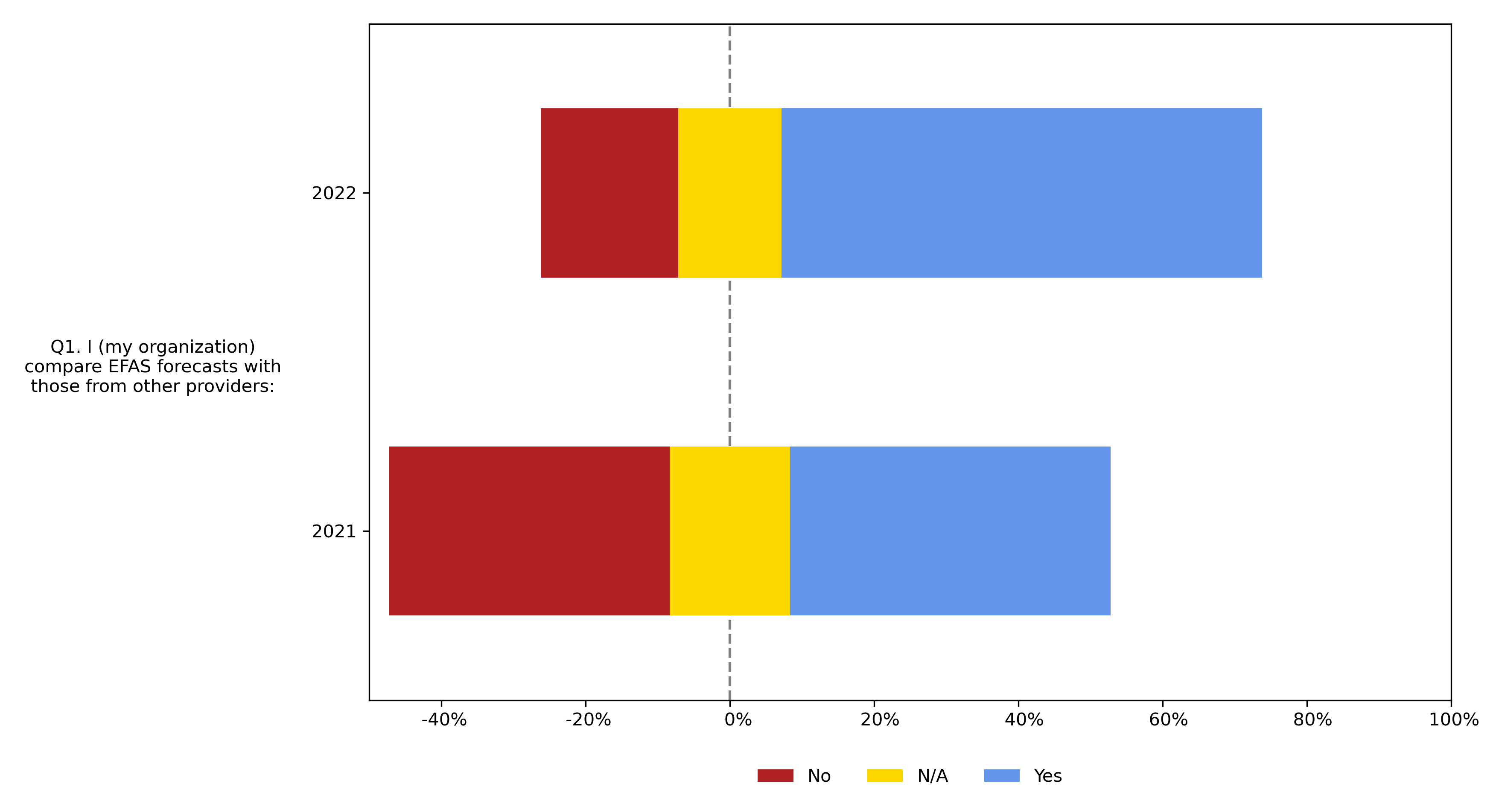 EFAS provides complementary flood forecast information to relevant stakeholders to support flood risk management at the national, regional and global level. From 2021 to 2022, there was an increase in the percentage of respondents/organizations who compare EFAS forecasts with those from other providers; in 2022, 67% of participants responded "yes" compared to 44% in 2021.