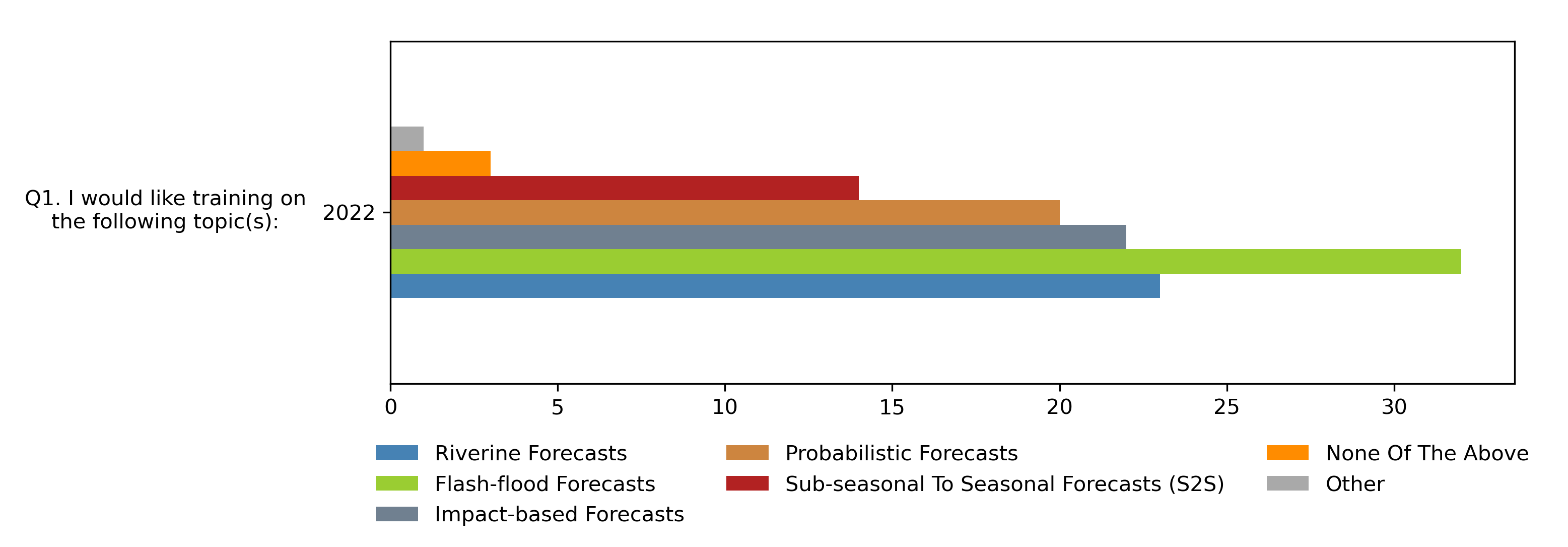 The participants were then asked in which topic(s) they would like to receive training. Overall, flash-flood forecasts were the most popular option with 76% of participants indicating that they would like training on the topic. Approximately half of the participants were also interested in receiving training on the riverine forecasts (55%), impact-based forecasts (52%), and probabilistic forecasts (48%). One participant selected the “Other” option and wrote that they would like to receive training on LISFLOOD.