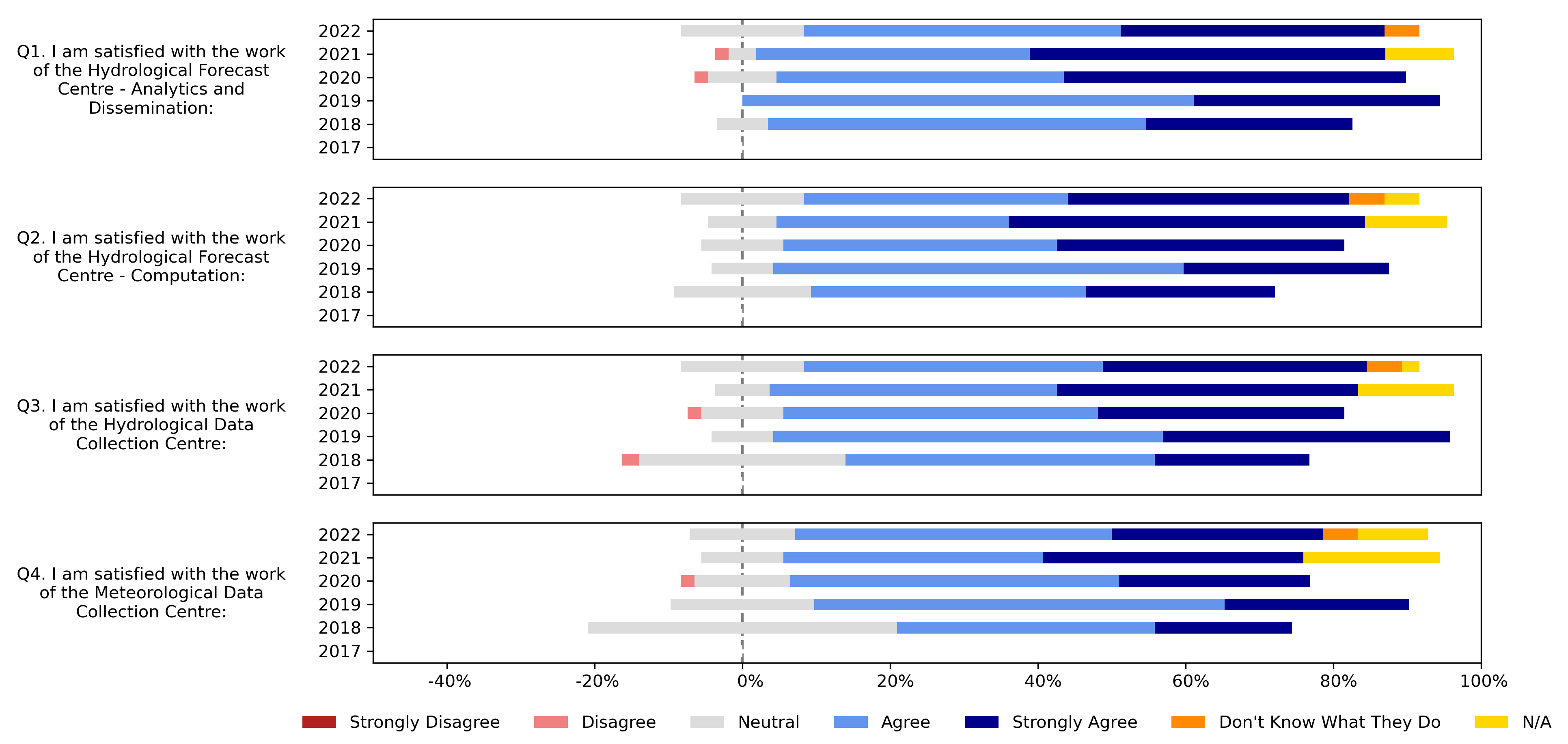 Satisfaction with each of the EFAS centres in 2022 was predominantly positive and similar to that of previous years. Note that the "Don't Know What They Do" option was introduced in the 2022 survey.