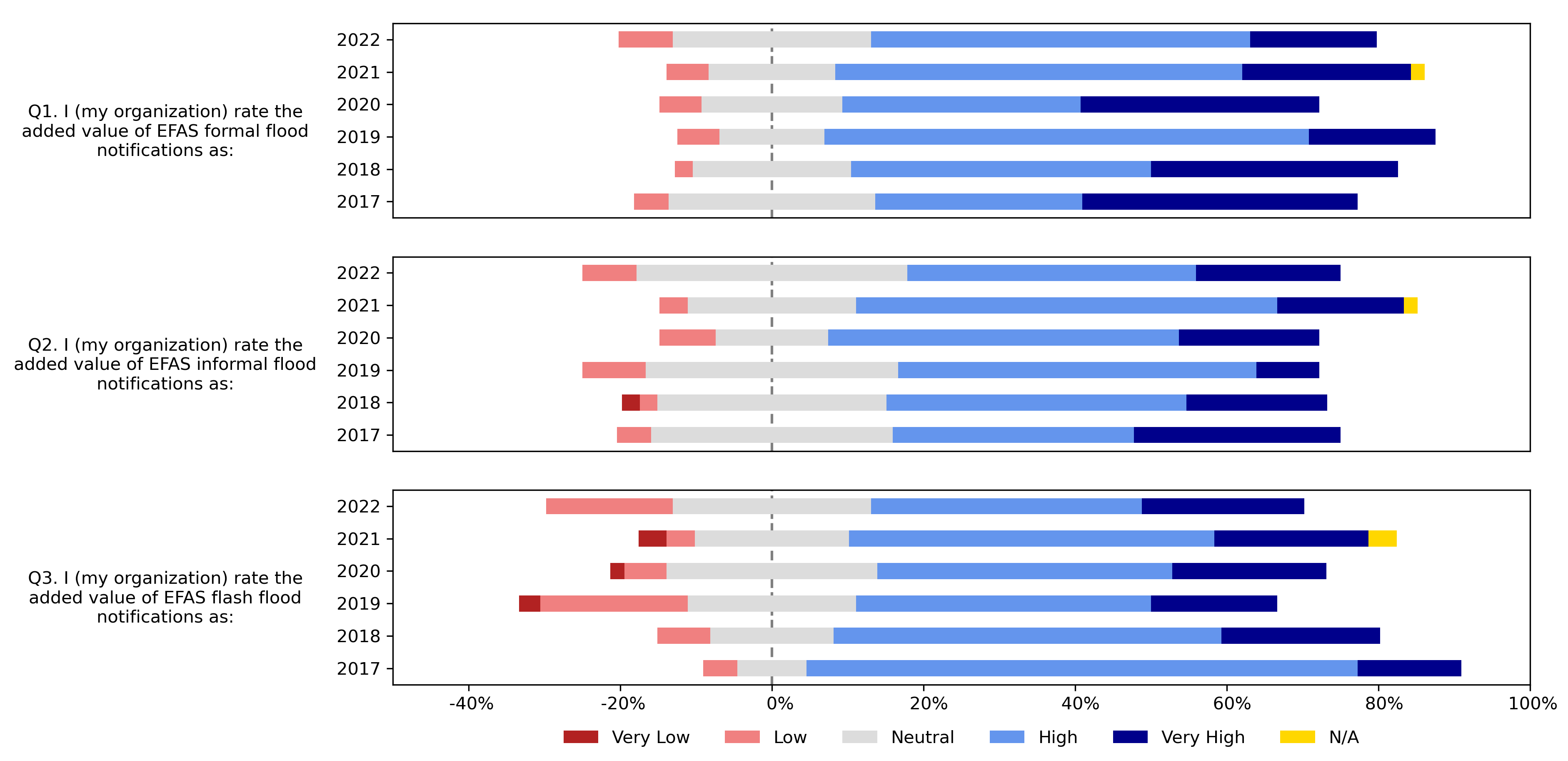 The ratings of the added value of the different EFAS notifications in 2022 were generally similar to those of the previous survey years. For 2021, survey participants rated the added value of the notifications very highly; in 2022, there was a slight decrease in the ratings of the added value. In general, however, most survey participants rate the added value of the different notifications as either high or very high, and there have not been major changes in the responses between survey years.