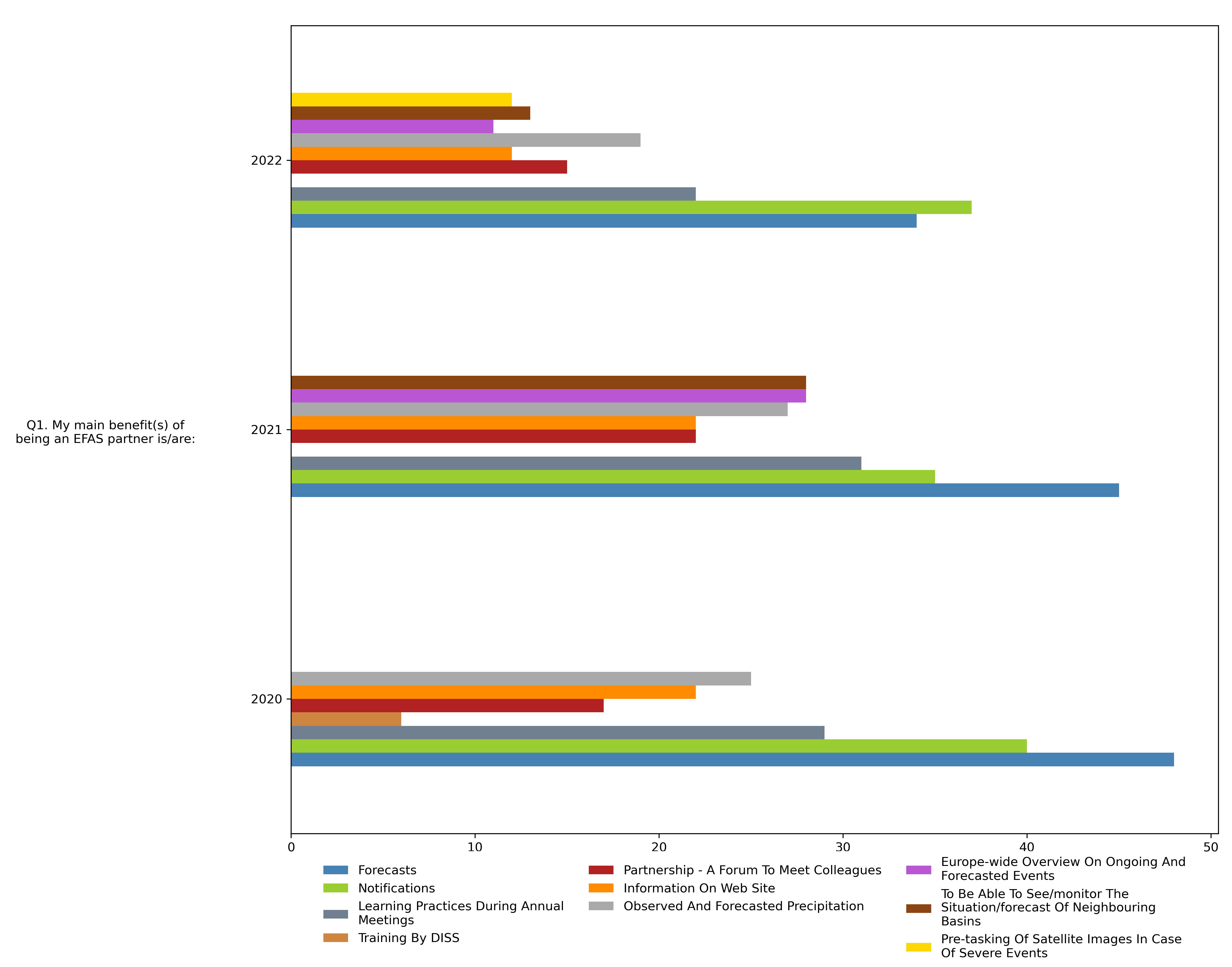 Survey participants provided similar responses in 2022 as in previous years when asked to identify their main benefits of being an EFAS partner. Like in 2020 and 2021, the most selected options in 2022 were notifications, forecasts, and learning practices during annual meetings. Respondents have also consistently indicated that observed and forecasted precipitation and partnership are important benefits of being an EFAS partner. It is here noted that the option "Training by DISS" was not provided after 2020.