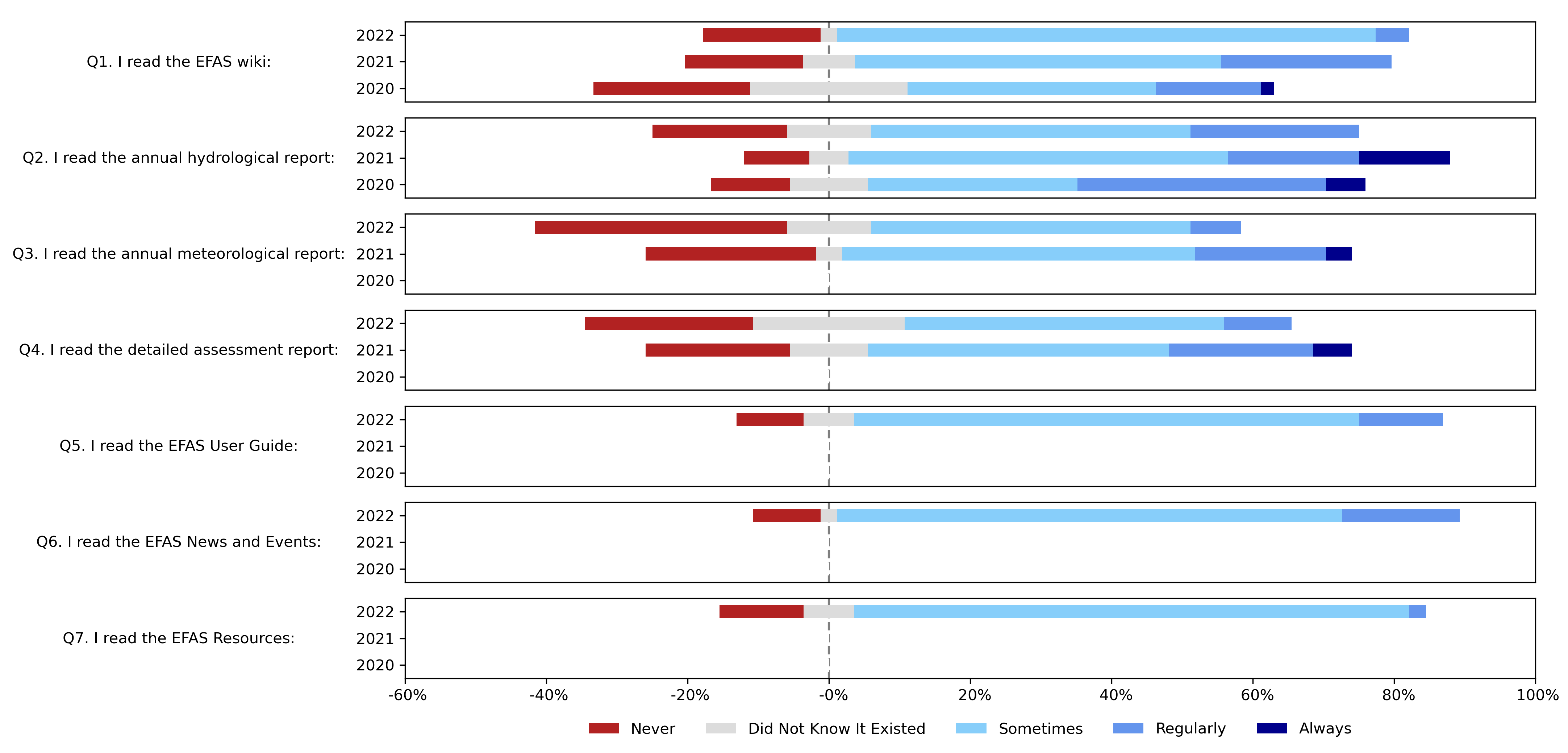 In 2022, the EFAS Wiki, User Guide, News and Events, and Resources were the most-read informative resources with 81-88% of participants reading them at least sometimes. In contrast, the three reports were the least read resources with only 52-69% of participants reading them at least sometimes. Overall, there was a decrease in the proportion of participants who read the reports in 2022 compared to 2021; for the 2022 survey, 48% and 45% of the participants responded that they never read the report or did not know that it existed for the annual meteorological report and the detailed assessment report, respectively.