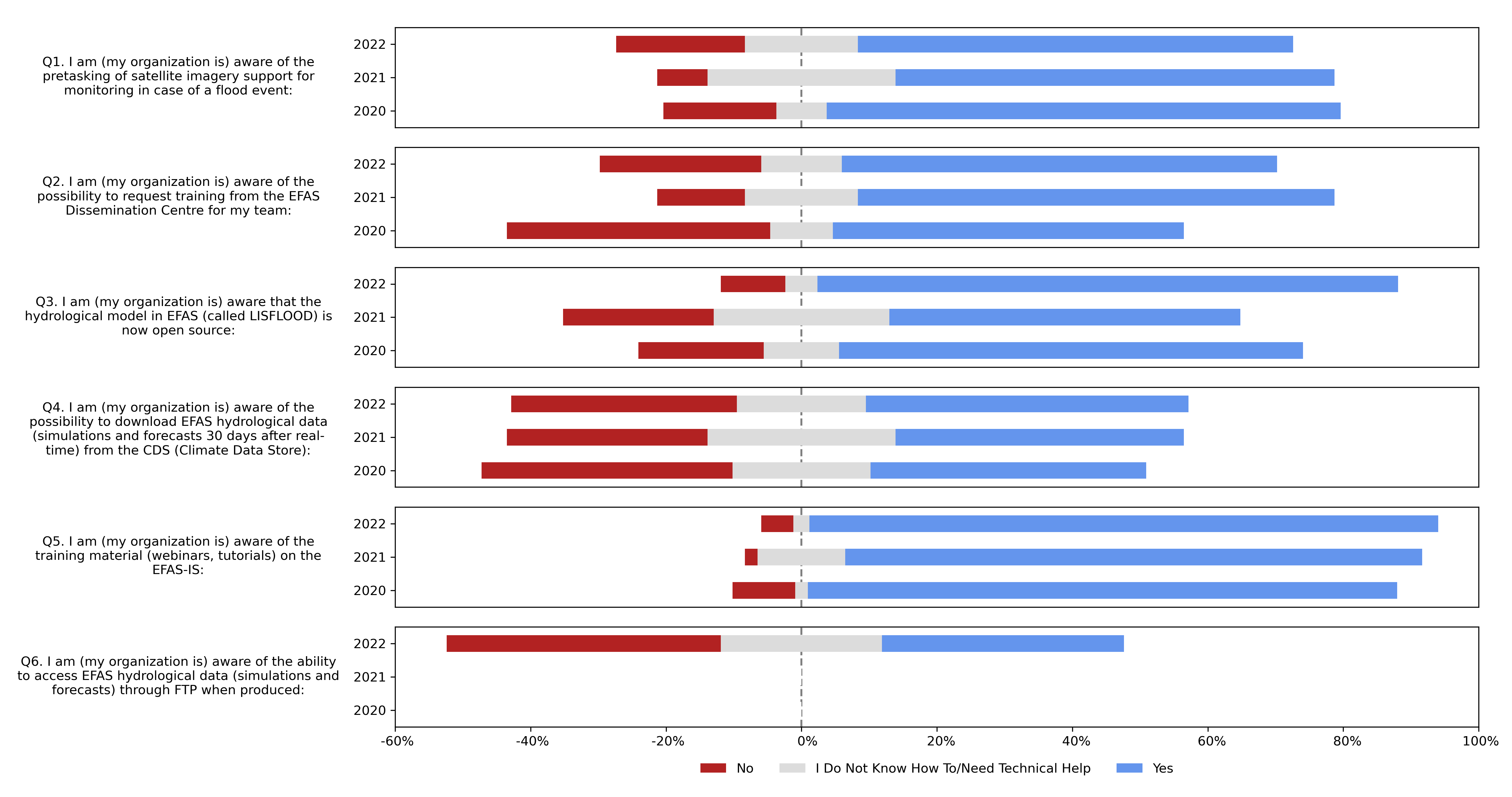 Overall, awareness of the different EFAS products and features in 2022 was similar to that of the previous surveys. From 2020-2022, the highest awareness was about the training material on the EFAS-IS. From 2021 to 2022, there was a large increase in awareness that the LISFLOOD hydrological model used in EFAS is now open source. Awareness was also generally high for: (1) pre-tasking of satellite imagery for monitoring in case of a flood event, and (2) the possibility to request training from the EFAS Dissemination Centre. In contrast, awareness was lowest about the possibility to download EFAS hydrological data from the Climate Data Store and the ability to access EFAS hydrological data through FTP.