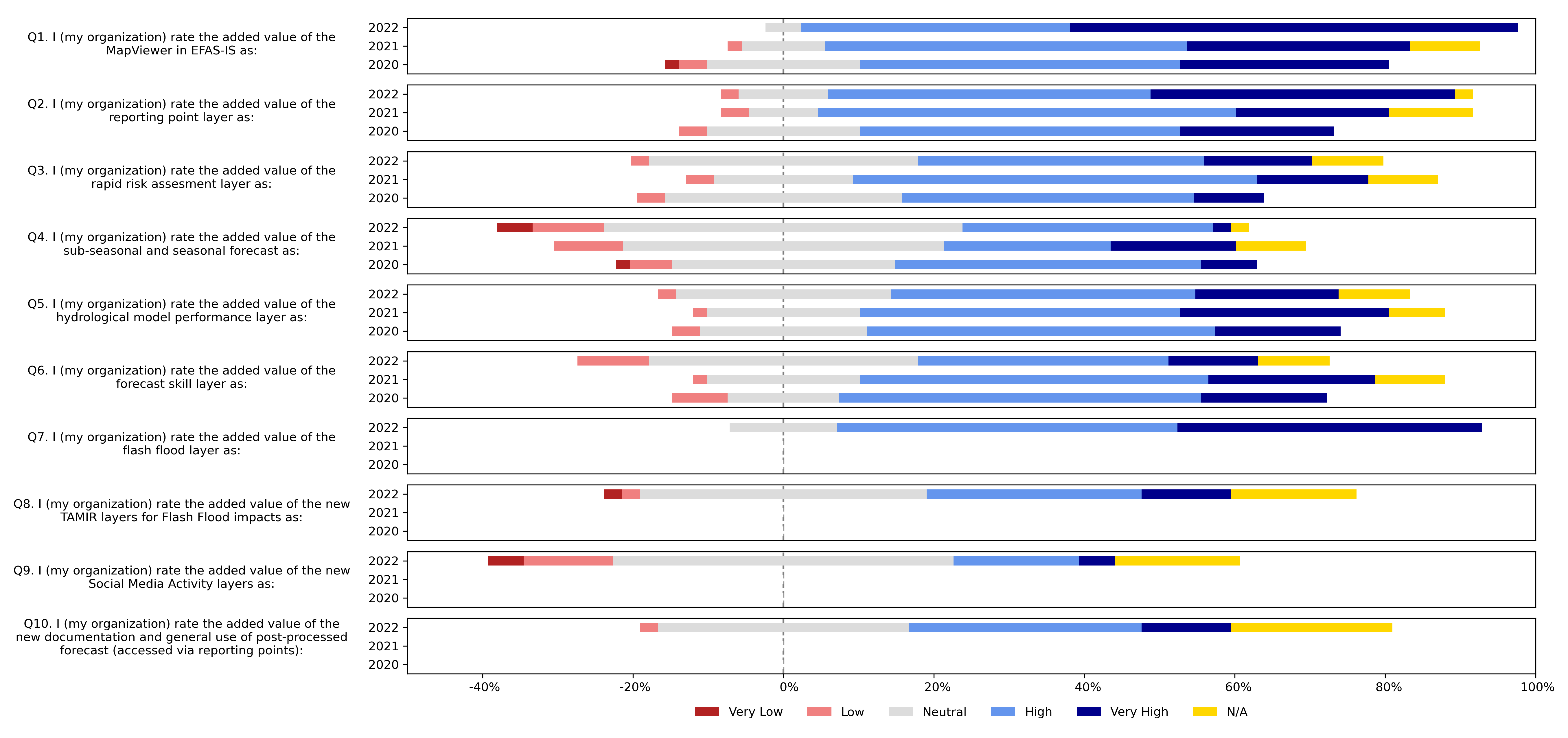 Ratings for the usability or added value of the EFAS products in 2022 were generally similar to those in 2021 and higher than those in 2020. Participants were especially positive about the added value of the MapViewer in EFAS-IS and the added value of the flash flood forecast layer. The added value of the sub-seasonal and seasonal forecast and the new social media activity layers were ranked lowest.