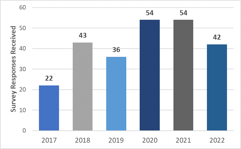 The 2022 EFAS partner survey was sent to all partners in January 2023. This survey was intended to assess the general satisfaction with the EFAS service, products and performance during the year 2022. The 2022 survey was anonymous, and a total of 42 responses were received, which was similar to the number of responses received during the 2017-2021 surveys (Figure 1).