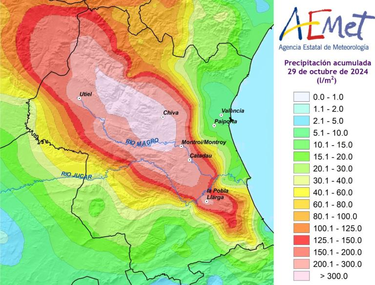 According to AEMET figures, the weather station in Turís in the province of Valencia, experienced record-breaking rainfall with new national records set for one-hour, six-hour, and twelve-hour totals. The maximum hourly rainfall of 185 l/m² exceeded the previous record of 159 l/m² set in Vinaròs, Castellón Province, in 2018. Six-hour and twelve-hour totals in Turís reached 621 l/m²and 720 l/m²respectively, doubling the previous extremes, recorded in Alpandeire in Málaga Province in 2018.